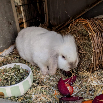 Der Widder-Löwenkopfmix Muffin ist im Februar 2025 geboren und kastriert.