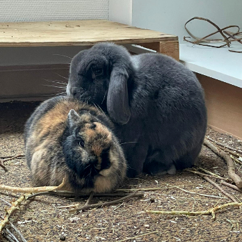Die zwei Kaninchen sind 5 Jahre alt, kastriert und im April 2025 geimpft. Das Zwergkaninchen Coco ist sehr aufgeweckt und neugierig. Mr. Grey ist ein Zwergwidder, eher gemütlich, der aber auch richtig rumflitzen kann und Streicheleinheiten geniesst, wie Coco auch. Mehr Infos unter 0151 / 67525999